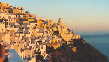 < Breathtaking views can be seen from any little alleyway on the clifftop villages of Santorini. |