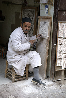 ^ One of many of shoe shops selling "babouche" slippers. < An ornate shop front selling antiques and artifacts. Large doors at front were made of copper.