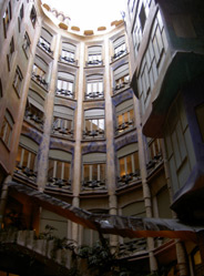 ^ Up on the rooftop of La Pedrera. The little dormer windows in the foreground form part of the roof of the central courtyard. As you can see the weather was on the miserable side and made walking on the tiles a wee bit slippery. In the photo to the left, you can see the Temple de la Sagrada Familia in the background. Note several cranes towering over it. Below is a snapshot of the internal courtyard.